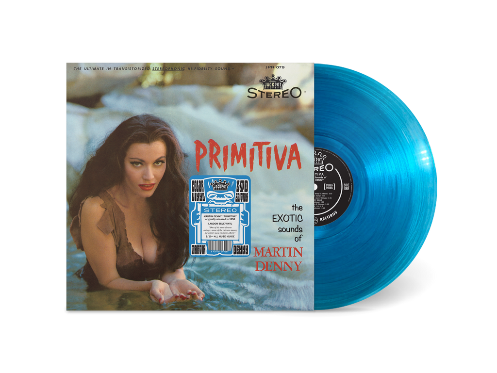 Originally released in 1958, Primitiva is a rhythmically rich and inimitably exotic Martin Denny experience. Reissued by Jackpot Records on limited edition lagoon blue color vinyl, Primitiva highlights the burgeoning sound of ’50s exotica music, with Denny’s diverse soundscape ranging from vibraphones and marimbas, to Burmese gongs and Buddhist prayer bowls. This third outing from the father of exotica shines in style with stand-out tracks like “Burma Train”, “M'Gambo Mambo”, and “Jamaica Farewell” spanning from the Caribbean coast, to the South Pacific islands, and beyond. Pairing perfectly with beachside Mai Tais and ornamental umbrellas, Primitiva is a hallmark of the mid-century’s lounge music fascination, and is replete with animal cries, pulsing percussion, and enough groovy goodness to keep it a mainstay of your rotation.